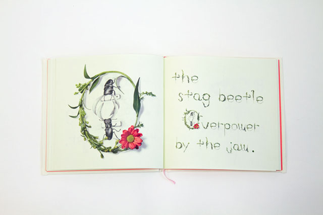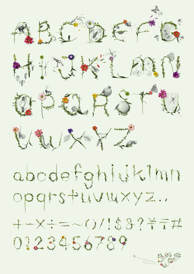 アルファベットにちなんだ虫を描きました。文字は本物の草花で創作してます。